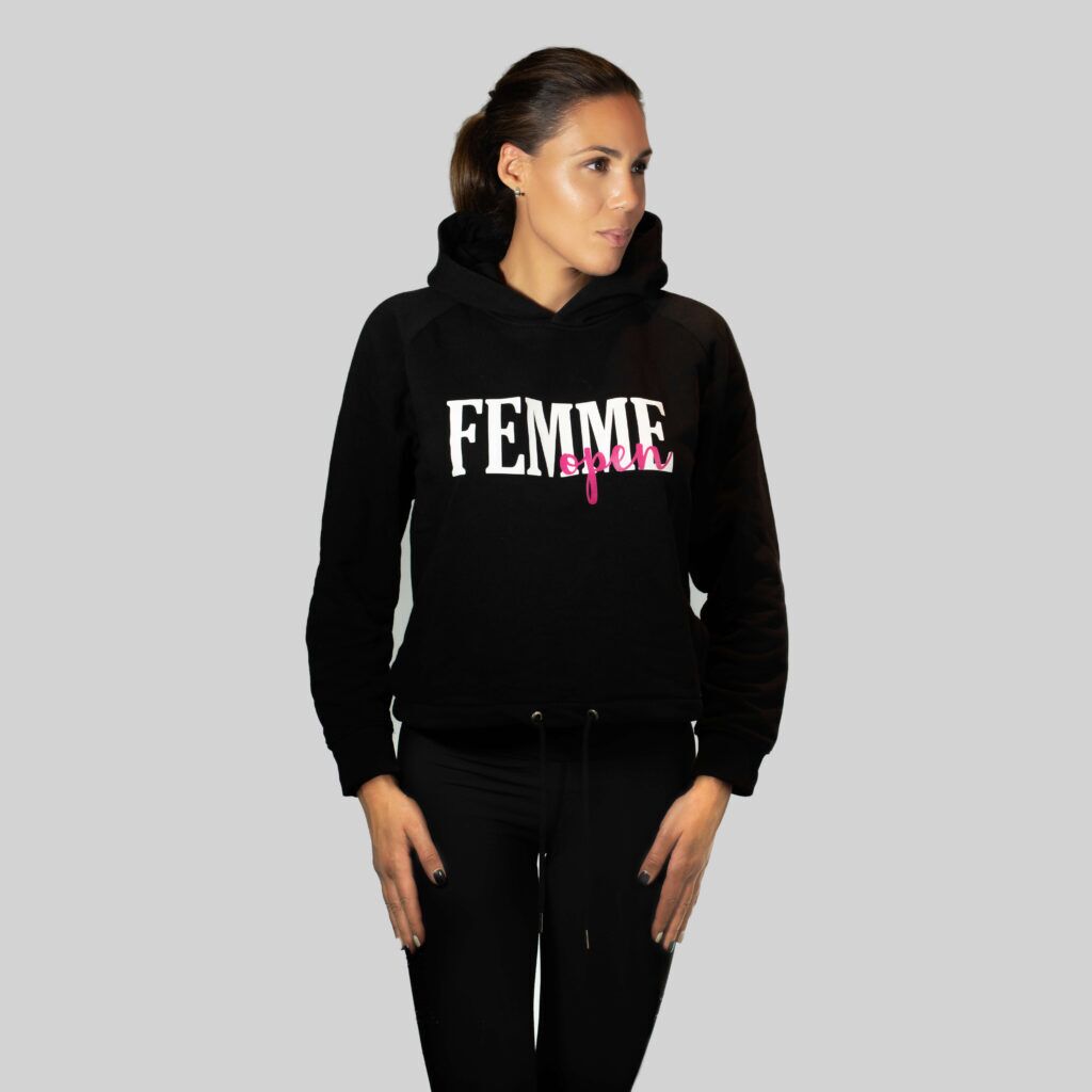 It’s the only iconic Femme open hoodie. This stylish, soft hoodie is made of 85% organic cotton and 15% recycled polyester. It is decorated with the Femme open logo and a drawstring in the bottom to give a fashionable and relaxed look. It is super comfy to wear for your padel games and cosy days.